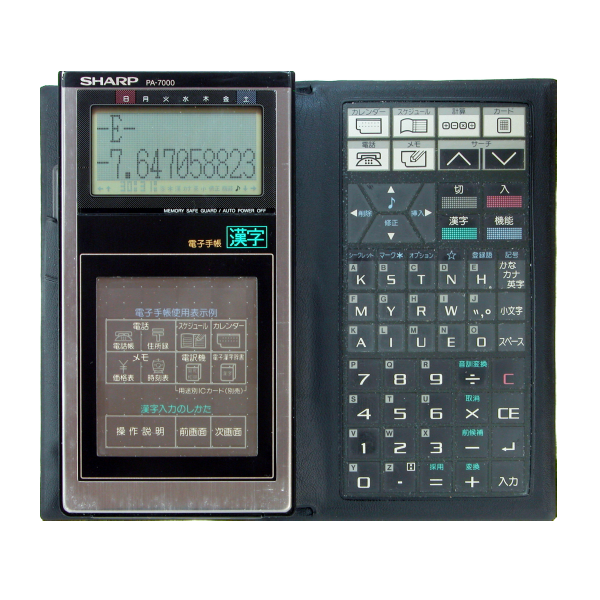 But by 1987, things changed when Sharp release of the PA-7000. Initially released in Japan, the PA-7000 was a true revolution in the personal organizers market. It was the first personal organizers with the ability to display kanji which was a huge feature in Japan. It supported external program card (called IC Cards for Integrated Circuit Cards) which allowed to expand the capacity of the organizer. The card are inserted under a touch sensitive transparent plastic window that expanded the capabilities of the device even further by adding the ability to interact with the program using this touch screen. The trick was to print the control scheme directly on the card so, once inserted under the touch sensitive window, the printed controls would become actual button.